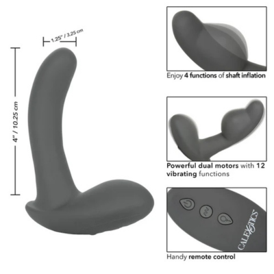 Η Eclipse Rem Inflatable Probe της CalExotics διαθέτει κομψό γκρι χρώμα και συνδυάζει σιλικόνη υψηλής ποιότητας με άξονα που προσφέρει 4 επίπεδα διόγκωσης, επιτρέποντας σταδιακή και ελεγχόμενη αύξηση της αίσθησης. Οι 16 λειτουργίες δόνησης λειτουργούν ανεξάρτητα από τη διόγκωση, δημιουργώντας βαθιές, παλλόμενες δονήσεις που προσαρμόζονται εύκολα στη ροή της στιγμής.